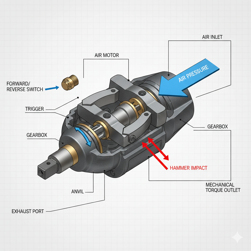 Das Herz eines pneumatischer Schlagschrauber ist sein Luftmotor. Wenn der Benutzer den Abzug drückt, gelangt Druckluft in das Werkzeug und dreht einen Rotor. Dieser Rotor ist mit einem „Schlagmechanismus“ verbunden – normalerweise einem Doppelhammer- oder Schaukelhund-Design. Wenn sich der Rotor dreht, baut er kinetische Energie auf. Wenn der Widerstand des Bolzens größer wird als die Drehkraft des Motors, schlagen die internen Hämmer auf die Abtriebswelle (den Amboss) und erzeugen einen plötzlichen, massiven Drehkraftstoß. Dies geschieht hunderte oder sogar tausende Male pro Minute.
